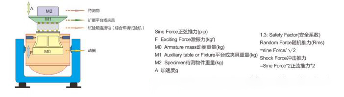 由于三軸電磁振動臺的主參數(shù)是以激振力大小命名與排序的,根據(jù)已知的參數(shù),利用∑ m x a= ( mmm+ m4) x a計算出激振力的大小,并加1.3安全系數(shù),便能確定在加速度區(qū)域所需的激振力的大小,并以此作為選定相應(yīng)型號的依據(jù)。